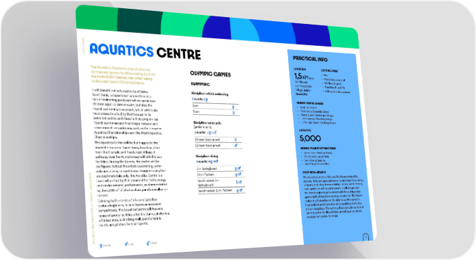 4 2 0 S 2 PRACTICAL INFO I R A AQUATICS CENTRE P LOCATION GETTING THERE • Bus The Aquatics Centre is one of the two OLYMPIC GAMES 1,5 KM from • Metro lines 13 and 14 permanent sports facilities being built for the Olympic • RER lines B and D the Paris 2024 Games, the other being SWIMMING and Paralympic • Tramlines T1 and T8 Le Bourget Sport Climbing Venue. Village, Saint- • Vélib’ public bike stations Discipline: artistic swimming Denis (93) It will benefit not only residents of Seine- Saint-Denis, a department where there is a 2 events: 2 NEARBY GAMES VENUES lack of swimming pools and where one in two • Stade de France children aged 11 cannot swim, but also the Duet • Porte de La Chapelle Arena French swimming movement, which will finally Team • Olympic and Paralympic Village have access to a facility that lives up to its • La Courneuve Shooting Range potential and its ambitions to help prepare top Discipline: water polo • Le Bourget Sport Climbing Venue French swimmers and host major national and (preliminaries) international competitions, such as the European CAPACITY Aquatics Championships and the World Aquatics 2 events: 1 / 1 Championships. 10-team tournament 5,000 The Aquatics Centre will be built opposite the 12-team tournament Stade the France in Saint-Denis, less than 2 km NEARBY TOURIST ATTRACTIONS from the Olympic and Paralympic Village. A • Sacré-Cœur Basilica (Paris) walkway over the A1 motorway will link the two Discipline: diving • Montmartre area (Paris) facilities. During the Games, the centre will be 8 events: 4 / 4 • Saint-Denis Basilica configured to host the artistic swimming, water • Saint-Ouen flea market polo and diving competitions. Designed using bio- 3 m Springboard / T E sourced materials only, the Aquatics Centre is a 10 m Platform / POST-2024 LEGACY E H low-carbon facility that is committed to its energy The Aquatics Centre will be used by the general public, A S Synchronised 3 m T and environmental performance, as demonstrated / schools, clubs and associations on a daily basis for a variety A Springboard S : D by the 5,000 m² of photovoltaic panels installed on of sports, including fitness activities, tennis, paddle tennis, E its roof. Synchronised 10 m Platform / team sports, as well as water sports. It will also provide U N the French swimming movement with the cutting-edge E Catering to the needs of all users (whether C V sports facility it has been waiting decades for. The French I curious beginners, leisure lovers or seasoned Swimming Federation will be able to use the centre to P M competitors), the Aquatics Centre will house a host national and international competitions for its four Y L A range of sports facilities after the Games, including indoor disciplines. The centre will also provide a national R A a fitness area, a climbing wall, paddle tennis training centre for elite athletes, as well as an advanced D P courts and pitches for team sports. development centre for divers. N C A I P M Y L O women men mixed 17