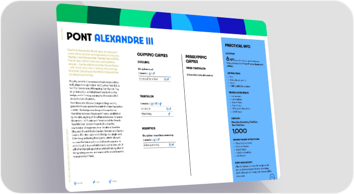 4 2 0 S 2 I PRACTICAL INFO R A PONT ALEXANDRE III P LOCATION The Pont Alexandre III will play a major part OLYMPIC GAMES PARALYMPIC 6 KM from the Olympic and Paralympic in the ‘Paris centre’ arrangements during the th th Olympic and Paralympic Games Paris 2024. GAMES Village, between the 7 and 8 arrondissements The bridge, which links two competition CYCLING of Paris. venues – Les Invalides and the Grand Palais PARA TRIATHLON – will, itself, host the triathlon, the cycling Discipline: road GETTING THERE time trial (serving as the finish line) and the 2 events: 1 / 1 Information to be determined • Bus marathon swimming. Individual Time Trial / • Metro, lines 8 and 13 • RER C The site, on which temporary infrastructure will be • Vélib’ public bike stations built, played a major role in 2017, when Paris’ bid to host the Games was still ongoing. For Olympic Day NEARBY GAMES VENUES on 23 June 2017, a diving board was built on the • La Concorde bridge, and a floating running track was installed TRIATHLON • Les Invalides along the Seine beside it. • Grand Palais Pont Alexandre III is no stranger to large events, 3 events: 1 / 1 / 1 • Pont d’Iéna given that it was opened to mark the Paris Exposition Individual / • Champ-de-Mars Arena in 1900. The bridge was designed to symbolise • Eiffel Tower friendship between Russia and France, established Mixed relay by the 1891 signing of the alliance between Emperor CAPACITY Alexander III of Russia and President of the French Marathon Swimming, Triathlon, Republic Sadi Carnot. It was built under the Para Triathlon : T supervision of engineers Jean Résal and Amédée AQUATICS E Alby, and the architects Cassien-Bernard and Gaston E H Cousin. The 45m-wide metal bridge is a single arch, 1,000 A S Discipline : marathon swimming T 107m long, including three joints, which allows it A S : D to cross the Seine with no additional supports. In 2 events: 1 / 1 NEARBY TOURIST ATTRACTIONS E and of itself, it is a veritable tourist attraction, which U 10 km swimming / • Place de la Concorde N E will offer Olympic spectators a breathtaking view of C V the sporting events, and some of the most beautiful • Champs-Élysées I • Grand Palais P monuments of Paris. M Y • Hôtel des Invalides L A • Eiffel Tower R A D P N POST-2024 LEGACY C A I After the Games, no trace will remain on the P M site, as all infrastructure built on the bridge Y L O for the Olympic and Paralympic Games will be women men mixed temporary. 35