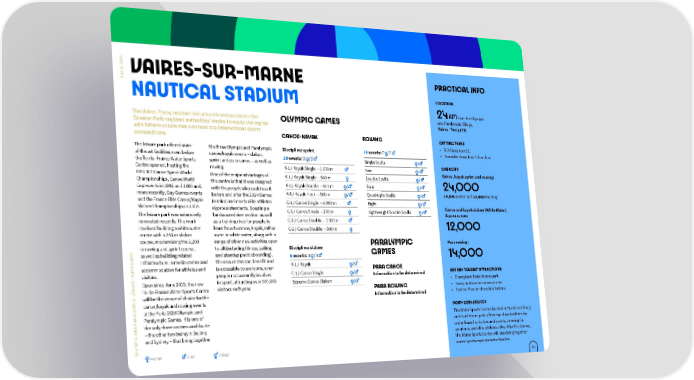 4 2 0 S 2 I VAIRES-SUR-MARNE PRACTICAL INFO R A P NAUTICAL STADIUM LOCATION 24 KM from the Olympic The Vaires-Torcy outdoor leisure park encapsulates the OLYMPIC GAMES and Paralympic Village, Greater Paris regional authorities’ desire to equip the region Vaires - Torcy (77) with infrastructure that can host top international sports competitions. CANOE-KAYAK ROWING GETTING THERE The leisure park offered state- the three Olympic and Paralympic • RER lines A and E Discipline: sprint 14 events: 7 / 7 • Transilien train line P, then bus of-the art facilities even before canoe/kayak events – slalom, 10 events: 5 / 5 the Île-de- France Water Sports sprint and para canoe – as well as Single Sculls / Centre opened, hosting the rowing. K-1 / Kayak Single – 1 000 m Pair / CAPACITY 1991 ICF Canoe Sprint World One of the major advantages of K-1 / Kayak Single – 500 m Double Sculls / Canoe, kayak sprint and rowing: Championships, Canoe World the centre is that it was designed K-2 / Kayak Double – 500 m / Four Cup events in 1992 and 1996 and, with the people who could use it / 24,000 more recently, Gay Games events before and after the 2024 Games K-4 / Kayak Four – 500 m / Quadruple Sculls / 14,000 seated and 10,000 standing and the France Elite Canoe/Kayak in mind and meets elite athletes’ C-1 / Canoe Single – 1 000 m Eight / Slalom Championships in 2018. rigorous standards. Boasting a C-1 / Canoe Single – 200 m Lightweight Double Sculls Canoe and kayak slalom (White Water) The leisure park was extensively landscaped river section as well / & para canoe: renovated recently. The work as a training river for people to C-2 / Canoe Double – 1 000 m involved building a white water learn how to canoe, kayak, raft or C-2 / Canoe Double – 500 m 12,000 centre with a 250 m slalom swim in white water, along with a course, modernising the 2,200 range of other new activities open PARALYMPIC Para rowing: T m rowing and sprint course, to all (including fitness, sailing Discipline: slalom E as well as building related and standup paddleboarding), GAMES E 6 events: 3 / 3 14,000 H infrastructure, a media centre and the new centre can benefit and A S K-1 / Kayak / T accommodation for athletes and is accessible to everyone, even PARA CANOE A C-1 / Canoe Single visitors. people not currently involved / Information to be determined NEARBY TOURIST ATTRACTIONS S : D E Open since June 2019, the new in sport, attracting over 500,000 Extreme Canoe Slalom / • Disneyland Paris theme park U N visitors each year. • Torcy outdoor activities centre E Île-de-France Water Sports Centre PARA ROWING C V will be the venue of choice for the Information to be determined • Former Menier chocolate factory I P canoe/kayak and rowing events M Y L at the Paris 2024 Olympic and POST-2024 LEGACY A R A Paralympic Games. It is one of The Water Sports Centre located at the Vaires-Torcy D P the only three centres worldwide outdoor leisure park offers top-class facilities for N C A – the other two being in Beijing water-based activities and sports, catering for I P and Sydney – that bring together amateurs and elite athletes alike. After the Games, M Y L the Water Sports Centre will also bring together O water sports representative bodies. women men mixed 54