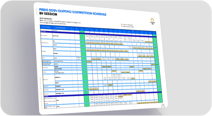 4 2 PARIS 2024 OLYMPIC COMPETITION SCHEDULE 0 S 2 I R BY SESSION A P Calendrier des compétitions par sessions des Jeux Olympiques de Paris 2024 Calendrier au 01/04/2022 Session avec médaille d'or AS OF 01/04/2022 REGLES ET CODE COULEUR Session avec médaille de bronze Gold medal session REGLES ET CODE COULEUR Note : This competition schedule by session is subject to changes until Note: This competition schedule by session is subject to changes until the conclusion of Paris Bronze medal session 2024 Olympic Games. the conclusion of Paris 2024 Olympic Games. July August COMPETITION VENUES SPORT / DISCIPLINE OR EVENT Wed Thu Fri Sat Sun Mon Tues Wed Thu Fri Sat Sun Mon Tue Wed Thu Fri Sat Sun 24 25 26 27 28 29 30 31 1 2 3 4 5 6 7 8 9 10 11 -2 -1 0 1 2 3 4 5 6 7 8 9 10 11 12 13 14 15 16 CEREMONIES PARIS CENTRE 10:00-14:00 09:00-13:00 09:00-13:00 09:00-13:00 09:00-12:00 09:00-12:00 09:00-12:00 09:00-12:00 09:00-11:00 09:00-11:00 16:00-19:00 15:00-18:00 15:00-18:00 15:00-18:00 15:00-18:00 15:00-18:00 15:00-18:00 16:00-19:00 13:00-15:00 13:00-15:00 Eiffel Tower Stadium BEACH VOLLEYBALL 17:00-19:00 17:00-19:00 17:00-19:00 17:00-19:00 17:00-19:00 21:00-00:00 20:00-23:00 20:00-23:00 20:00-23:00 20:00-23:00 20:00-23:00 20:00-23:00 21:00-00:00 21:00-23:00 21:00-23:00 21:00-23:00 21:00-23:00 21:00-23:00 21:00-00:00 21:00-00:00 10:00-14:00 10:00-14:00 10:00-14:00 10:00-14:00 10:00-14:00 10:00-14:00 10:00-14:00 08:00-14:00 JUDO 16:00-19:00 16:00-19:00 16:00-19:00 16:00-19:00 16:00-19:00 16:00-19:00 16:00-19:00 16:00-19:00 Champ de Mars Arena WRESTLING 15:00-17:00 11:00-13:30 11:00-13:30 11:00-13:30 11:00-13:30 11:00-13:30 11:00-14:30 21:00-22:00 18:15-22:00 18:15-22:00 18:15-22:00 18:15-22:00 18:15-22:00 FENCING 10:00-16:40 09:30-16:50 09:30-16:50 12:00-17:30 12:00-17:30 10:00-17:10 12:00-17:30 11:30-17:00 10:00-17:10 19:00-22:50 19:00-23:10 19:00-23:10 19:30-21:40 19:30-21:40 19:10-22:00 19:30-21:40 19:00-21:10 19:10-22:00 Grand Palais 09:00-12:30 09:00-12:30 09:00-12:30 09:00-12:30 TAEKWONDO 14:30-17:30 14:30-17:30 14:30-17:30 14:30-17:30 19:30-23:00 19:30-23:00 19:30-23:00 19:30-23:00 Invalides ARCHERY 09:30-12:30 09:30-11:05 09:30-11:05 12:00-15:55 12:00-15:55 09:30-13:25 09:30-12:05 09:30-11:15 09:30-11:15 14:15-17:15 14:15-17:55 14:15-17:55 17:45-20:20 17:45-20:20 15:30-19:30 14:15-17:25 13:00-15:20 13:00-15:20 Invalides (Start venue) - Pont CYCLING ROAD (TIME TRIAL) 14:30 - 18:30 Alexandre III (Finish venue) Hôtel de Ville (Start venue) - MARATHON 08:00-11:15 08:00-11:30 Invalides (Finish venue) TRIATHLON 08:00-10:30 08:00-10:40 08:00-10:10 Pont Alexandre III MARATHON SWIMMING 07:30-10:30 07:30-10:30 RACE WALK 07:30-11:45 07:30-11:00 Pont d'Iéna CYCLING ROAD (ROAD RACE) 11:00-18:15 14:00-18:45 09:00-11:00 09:00-11:00 T BASKETBALL 3x3 12:30-14:30 12:30-14:30 E 17:30-19:30 17:30-19:30 18:00-20:00 17:30-19:30 17:30-19:30 17:30-19:30 17:30-19:30 E H La Concorde 1 21:00-23:00 21:00-23:00 21:30-23:30 21:00-23:00 21:30-22:30 21:30-22:30 21:00-23:15 A S T BREAKING 16:00-18:00 16:00-18:00 A 20:00-22:00 20:00-22:00 S : D La Concorde 2 BMX FREESTYLE 14:00-16:30 14:00-16:30 E U N E La Concorde 3 SKATEBOARDING - STREET 12:00-15:30 12:00-15:30 C V 17:00-19:00 17:00-19:00 I P 11:30-14:30 11:30-14:30 M La Concorde 4 SKATEBOARDING - PARK Y 16:30-18:30 16:30-18:30 L A PARIS WEST R A 12:00-17:00 12:00-17:00 12:00-17:00 12:00-17:00 12:00-17:00 12:00-17:00 12:00-17:00 12:00-19:00 12:00-19:00 Roland-Garros Stadium - P. Chatrier D P 19:00-23:00 19:00-23:00 19:00-23:00 19:00-23:00 19:00-23:00 19:00-23:00 19:00-23:30 N Roland-Garros Stadium - S. Mathieu TENNIS 12:00-19:00 12:00-19:00 12:00-19:00 12:00-19:00 12:00-19:00 12:00-19:00 12:00-17:00 C A Side courts 12:00-19:00 12:00-19:00 12:00-19:00 12:00-19:00 12:00-19:00 12:00-19:00 I P M Y Roland-Garros Stadium - Suzanne BOXING 10:30-14:00 10:30-14:00 10:30-14:00 10:30-14:00 10:30-14:00 10:30-14:00 10:30-14:00 10:30-14:00 L Lenglen O 19:30-23:00 19:30-23:00 19:30-23:00 19:30-23:00 19:30-23:00 19:30-23:00 19:30-23:00 19:30-23:00 19:30-23:00 20:00-23:00 20:00-23:00 20:00-23:00 20:00-23:00 20:00-23:00 #C1-INTERNAL 70