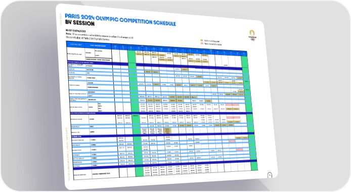 July August COMPETITION VENUES SPORT / DISCIPLINE OR EVENT Wed Thu Fri Sat Sun Mon Tues Wed Thu Fri Sat Sun Mon Tue Wed Thu Fri Sat Sun 24 25 26 27 28 29 30 31 1 2 3 4 5 6 7 8 9 10 11 -2 -1 0 1 2 3 4 5 6 7 8 9 10 11 12 13 14 15 16 09:00-11:30 09:00-11:30 09:00-11:30 9:00-11:30 09:00-11:30 09:00-11:30 09:00-11:30 09:00-11:30 09:00-11:30 09:00-11:30 09:00-11:30 South Paris Arena 1 VOLLEYBALL 13:00-15:30 13:00-15:30 13:00-15:30 13:00-15:30 13:00-15:30 13:00-15:30 13:00-15:30 13:00-15:30 13:00-15:30 13:00-15:30 13:00-15:30 13:00-15:30 13:00-15:45 17:00-19:30 17:00-19:30 17:00-19:30 17:00-19:30 17:00-19:30 17:00-19:30 17:00-19:30 17:00-19:30 17:00-19:30 17:00-19:30 17:00-19:30 16:00-18:30 16:00-18:30 17:00-19:30 17:00-19:45 21:00-23:30 21:00-23:30 21:00-23:30 21:00-23:30 21:00-23:30 21:00-23:30 21:00-23:30 21:00-23:30 21:00-23:30 21:00-23:30 21:00-23:30 20:00-22:30 20:00-22:30 10:00-13:00 10:00-13:00 10:00 -12:00 10:00-13:00 10:00-13:00 10:00-12:00 10:00-13:00 10:00-13:00 10:00-13:00 10:00-13:00 10:00-13:00 10:00-13:00 South Paris Arena 4 TABLE TENNIS 15:00-18:00 15:00-18:00 15:00-18:00 13:30-16:00 15:00-18:00 15:00-18:00 13:30-15:30 13:30-16:00 13:30-16:00 15:00-18:00 15:00-18:00 15:00-18:00 15:00-18:00 15:00-18:30 15:00-18:30 20:00-23:00 20:00-23:00 20:00-23:00 20:00-23:00 20:00-23:00 20:00-23:00 20:00-23:00 20:00-23:00 20:00-23:00 11:30-14:00 11:30-14:00 South Paris Arena 6 WEIGHTLIFTING 15:00-17:30 15:00-17:30 15:00-17:30 16:00-18:30 19:30-22:00 19:30-22:00 19:30-22:00 20:30-23:00 ARENAS 11:00-13:00 11:00-13:00 10:30-12:30 BASKETBALL (FINALS PHASE) 14:30-16:30 14:30-16:30 14:00-16:30 18:00-20:00 18:00-20:00 17:30-19:30 17:30-19:30 18:00-20:00 21:30-23:30 21:30-23:30 21:00-23:00 21:00-23:00 21:30-00:00 11:00-13:30 09:30-13:20 Bercy Arena ARTISTIC GYMNASTICS 14:50-16:30 13:00-15:25 15:30-18:00 18:00-19:40 15:30-18:50 15:00-17:25 20:00-22:30 21:10-22:50 17:30-20:30 17:30-19:45 17:30-20:15 18:00-20:10 12:00-14:30 TRAMPOLINE 18:00-20:30 08:30-12:00 08:30-12:00 08:30-12:00 08:30-12:00 08:30-12:00 08:30-11:00 08:30-13:00 08:30-13:00 08:30-13:00 09:45-12:30 BADMINTON 14:00-17:30 14:00-17:30 14:00-17:30 14:00-17:30 14:00-17:30 13:00-16:30 15:00-22:30 15:00-17:30 15:00-17:30 14:30-17:30 Porte de La Chapelle Arena 19:30-23:00 19:30-23:00 19:30-23:00 19:30-23:00 19:30-23:00 18:30 - 22:00 RYTHMIC GYMNASTICS 10:00-13:00 10:00-12:30 14:00-15:45 15:00-18:00 14:30-17:00 SWIMMING 11:00-13:00 11:00-13:00 11:00-13:00 11:00-13:00 11:00-13:00 11:00-13:00 11:00-13:00 11:00-13:00 20:30-22:30 20:30-22:30 20:30-22:30 20:30-22:30 20:30-22:30 20:30-22:30 20:30-22:30 20:30-22:30 18:30-20:30 Paris La Defense Arena 09:00-12:00 09:00-12:00 WATER POLO (FINALS PHASE) 12:00-16:30 14:00-17:00 14:00-17:00 13:00-16:00 13:00-16:00 14:00-17:20 14:00-17:20 18:30-23:00 19:00-22:00 19:00-22:00 18:00-21:00 18:00-21:00 SEINE-SAINT-DENIS 4 ARTISTIC SWIMMING 19:30-21:45 19:30-21:30 19:30-21:30 19:30-21:30 19:30-21:30 2 11:00-12:00 11:00-12:00 11:00-12:00 11:00-12:00 10:00-12:00 10:00-12:00 10:00-12:00 10:00-12:00 10:00-12:00 10:00-12:00 0 PARIS 2024 OLYMPIC COMPETITION SCHEDULE DIVING 15:00-17:00 15:00-17:00 15:00-17:00 15:00-17:00 15:00-17:00 15:00-17:00 S 2 Aquatics Centre I R BY SESSION 10:30-13:30 10:30-13:30 10:30-13:30 10:30-13:30 A WATER POLO (PRELIMINARIES PHASE) 14:00-17:00 15:00-18:00 14:00-17:00 15:00-18:00 14:00-17:00 15:00-18:00 14:00-17:00 15:00-18:00 14:00-17:00 P 18:30-21:30 19:30-22:30 18:30-21:30 19:30-22:30 18:30-21:30 19:30-22:30 18:30-21:30 19:30-22:30 18:30-21:30 AS OF 01/04/2022 10:00-14:00 10:00-16:00 10:00 -13:00 10:00-13:00 10:00-13:00 10:00-13:00 10:00-13:00 10:00-13:00 ATHLETICS (TRACK & FIELD) Gold medal session Note : This competition schedule by session is subject to changes until 19:00-22:00 19:00-22:00 19:00-22:00 19:00-22:00 19:00-22:00 19:00-22:00 19:00-22:00 19:00-22:00 19:00-22:00 Stade de France Bronze medal session the conclusion of Paris 2024 Olympic Games. 15:30-22:00 14:00-17:00 14:30-20:45 15:30-22:00 14:00-17:00 14:30-20:45 RUGBY 20:00-23:00 20:00-23:00 July August 10:30-14:00 10:30-14:00 Le Bourget Sport Climbing Venue SPORT CLIMBING Wed Thu Fri Sat Sun Mon Tues Wed Thu Fri Sat Sun Mon Tue Wed Thu Fri Sat Sun COMPETITION VENUES SPORT / DISCIPLINE OR EVENT 17:00-19:45 17:00-19:45 17:00-20:00 17:00-20:00 24 25 26 27 28 29 30 31 1 2 3 4 5 6 7 8 9 10 11 -2 -1 0 1 2 3 4 5 6 7 8 9 10 11 12 13 14 15 16 ILE-DE-FRANCE REGION (EXCEPT SEINE-SAINT-DENIS) 09:00-13:15 09:00-13:00 09:00-10:00 09:00-13:00 12:00-16:00 12:00-17:00 09:00-11:00 09:00-17:00 09:00-11:00 Rifle and Pistol Saint-Quentin-en-Yvelines BMX 09:00-12:00 09:00-13:30 09:00-13:30 09:00-11:00 09:00-11:00 09:00-11:00 BMX RACING 20:30-22:30 20:30-22:30 Stadium SHOOTING La Courneuve Shooting range Shotgun 09:00-15:30 09:00-14:40 10:00-14:00 09:00-14:00 09:00-15:30 09:30-14:30 09:00-13:30 Elancourt Hill MOUTAIN BIKE July 14:00-16:30 14:00-16:30 15:30-17:30 15:30-17:30 15:30-17:45 15:00-17:15 15:00-17:15 August COMPETITION VENUES SPORT / DISCIPLINE OR EVENT Wed Thu Fri Sat Sun Mon Tues Wed Thu Fri Sat Sun Mon Tue Wed Thu Fri Sat Sun MODERN PENTATHLON - FENCING RANKING ROUND 24 25 26 27 28 29 30 31 1 2 3 4 5 6 7 8 9 10 11 11:00-17:30 Golf National GOLF 09:00-18:00 09:00-18:00 09:00-18:00 09:00-18:00 09:00-18:00 09:00-18:00 09:00-18:00 09:00-18:00 -2 -1 0 1 2 3 4 5 6 7 8 9 10 11 12 13 14 15 16 ILE-DE-FRANCE REGION (EXCEPT SEINE-SAINT-DENIS) 12:45-15:30 14:00-15:45 11:00-14:15 Saint-Quentin-en-Yvelines CYCLING TRACK Saint-Quentin-en-Yvelines BMX Velodrome BMX RACING 20:30-22:30 20:30-22:30 17:00-19:40 17:30-19:55 17:30-19:50 17:00-19:55 18:00-19:55 17:00-19:50 Stadium #C1-INTERNAL EQUESTRIAN 10:00-18:40 10:30-15:00 11:00-16:30 11:00-16:00 11:00-16:00 10:00-15:45 14:00-17:45 10:00-12:30 11:00-15:30 11:00-13:45 14:00-16:30 Elancourt Hill MOUTAIN BIKE 14:00-16:30 14:00-16:30 Château de Versailles 09:30-15:30 11:00-13:30 Golf National GOLF 09:00-18:00 09:00-18:00 09:00-18:00 09:00-18:00 09:00-18:00 09:00-18:00 09:00-18:00 09:00-18:00 MODERN PENTATHLON 