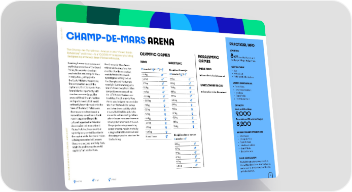 4 2 0 S 2 PRACTICAL INFO I R A CHAMP-DE-MARS ARENA P LOCATION The Champ-de-Mars Arena – known as the “Grand Palais OLYMPIC GAMES PARALYMPIC 8 KM from the Olympic and Éphémère” until now – is a 10,000 m² temporary building GAMES Paralympic Village, Paris, 7th arr. designed by architect Jean-Michel Wilmotte. JUDO WRESTLING GETTING THERE Boasting harmonious curves and The Champ-de-Mars Arena PARA JUDO • Bus aesthetics evocative of the Grand will remain in place for a few 15 events: 7 / 7 / 1 Discipline: Freestyle • Metro line 8 Palais, the wooden structure months after the renovation - 60 kg 12 events: 6 / 6 Information to be determined • Vélib’ public bike stations was installed at Champ de Mars work is finished to provide in early 2021, just opposite a prestigious setting to host - 66 kg 57 kg the École Militaire. Respecting the Olympic and Paralympic 65 kg NEARBY GAMES VENUES the composition axis of the events in Summer 2024, just a - 73 kg WHEELCHAIR RUGBY • Pont d’Iéna esplanade, the Champ-de-Mars stone’s throw away from other - 81 kg 74 kg • Eiffel Tower Stadium Arena blends in perfectly with competition venues such as - 90 kg 86 kg Information to be determined • Invalides its urban surroundings. The the Eiffel Tower Stadium and - 100 kg 97 kg • Grand Palais arena will host the art, fashion Invalides. The Champ-de-Mars 125 kg • Pont Alexandre III and sports events that would Arena was designed as a modular + 100 kg ordinarily have taken place in the structure that could be put up - 48 kg 50 kg CAPACITY Nave of the Grand Palais were and taken down quickly, which - 52 kg 53 kg Judo and Wrestling: the museum not undergoing means that it will be able to be - 57 kg 57 kg renovations, as well as cultural reused in various configurations 9,000 events organised by public after it leaves its current home at - 63 kg 62 kg cultural organisation Réunion Champ de Mars in Autumn 2024. 68 kg Para Judo and Wheelchair Rugby: des musées nationaux-Grand The project meets present-day - 70 kg 8,200 T - 78 kg 76 kg E Palais. Holding these events in environmental requirements by E H a prestigious, central location in using sustainable materials and + 78 kg A S NEARBY TOURIST ATTRACTIONS T the capital while the Grand Palais choosing a wooden structure for Discipline: Greco-roman A Mixed Team • Eiffel Tower S : D is being renovated will ensure the building. 6 events : 6 E they are a success and help Paris • Champ de Mars U N retain its position as the world 60 kg • École Militaire E C V capital of art and culture. 67 kg • Hôtel des Invalides I P • Grand Palais M 77 kg Y • Trocadéro area L A R 87 kg A D P 97 kg POST-2024 LEGACY N C A 130 kg The building is a temporary structure I P that will be taken down after the Games M Y and moved to another location that has L O yet to be decided. women men mixed 8