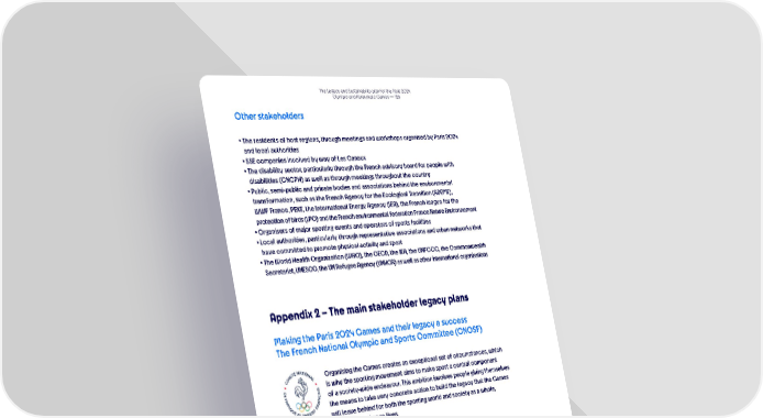 The Legacy and Sustainability plan for the Paris 2024 Olympic and Paralympic Games — 125 Other stakeholders • The residents of host regions, through meetings and workshops organised by Paris 2024 and local authorities • SSE companies involved by way of Les Canaux • The disability sector, particularly through the French advisory board for people with disabilities (CNCPH) as well as through meetings throughout the country • Public, semi-public and private bodies and associations behind the environmental transformation, such as the French Agency for the Ecological Transition (ADEME), WWF France, PEXE, the International Energy Agency (IEA), the French league for the protection of birds (LPO) and the French environmental federation France Nature Environnement • Organisers of major sporting events and operators of sports facilities • Local authorities, particularly through representative associations and urban networks that have committed to promote physical activity and sport • The World Health Organization (WHO), the OECD, the IEA, the UNFCCC, the Commonwealth Secretariat, UNESCO, the UN Refugee Agency (UNHCR) as well as other international organisations Appendix 2 – The main stakeholder legacy plans Making the Paris 2024 Games and their legacy a success The French National Olympic and Sports Committee (CNOSF) Organising the Games creates an exceptional set of circumstances, which is why the sporting movement aims to make sport a central component of a society-wide endeavour. This ambition involves people giving themselves the means to take very concrete action to build the legacy that the Games will leave behind for both the sporting world and society as a whole, as sport can change lives. Take a look at the CNOSF legacy plan • An ambitious legacy for the Paris 2024 Games The French Paralympic and Sports Committee (CPSF) The French Paralympic and Sports Committee (CPSF) France will be hosting its first-ever Paralympic Games from 28 August to 8 September 2024. With 22 sports, 23 disciplines and 4,350 athletes, Paris 2024 aims to make the competition a unique event; for instance, it became the first organising committee to choose a single emblem for both the Olympic and Paralympic Games. The Paris 2024 Paralympic Games are already an inspiration and must help fuel people’s dreams. Launched in March 2019 by the French Paralympic and Sports Committee in collaboration with all Paralympic federations, the “Relève” programme drew a highly positive response as 660 people signed up and 180 people – 40% of whom were women – took part in six scouting tests. Take a look at the CPSF legacy plan and its manifesto •