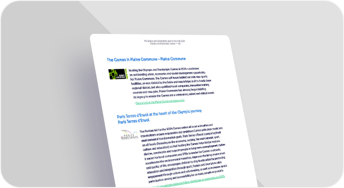 The Legacy and Sustainability plan for the Paris 2024 Olympic and Paralympic Games — 128 The Games in Plaine Commune – Plaine Commune Hosting the Olympic and Paralympic Games in 2024 constitutes an outstanding urban, economic and social development opportunity for Plaine Commune. The Games will leave behind not only new sports facilities, an eco district by the Seine and new bridges built to break down regional divides, but also upskilled local companies, innovative training courses and new jobs. Plaine Commune has already begun building its legacy to ensure the Games are a celebratory, united and ethical event. Take a look at the Plaine Commune legacy plan • Paris Terres d’Envol at the heart of the Olympic journey Paris Terres d’Envol The Parisian bid for the 2024 Games united all local authorities and stakeholders around responsible and ambitious Games with clear social and environmental transformation goals. Paris Terres d’Envol is preparing itself on all levels (focusing on the economy, society, the environment, sport, culture and education) so that hosting the Games helps bridge regional divides, create jobs and support people in long-term unemployment, makes it easier for local companies and SMEs to tender for Games contracts, accelerates the environmental transition, improves the living environment and quality of life, encourages children to stay in education by promoting education and integration through sport, fosters and champions civic engagement through culture and volunteering, as well as increases sports participation among and accessibility for as many people as possible. https://www.paristerresdenvol.fr/jeux-olympiques-et-paralympiques-2024 • (available in French only) Incr-east togetherness – Est Ensemble Grand Paris The Games constitute a truly unique opportunity for the Est Ensemble area to boost its international appeal and economic development. During the bidding phase, Est Ensemble assessed how the event could be a tool for economic development and employment, confirming there would be many Games-related job vacancies for local residents over the next few years. Take a look at the Est Ensemble Grand Paris heritage plan •