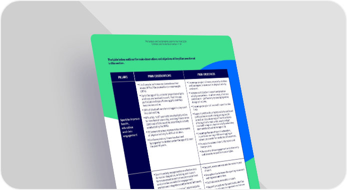 TThhe Le Leeggaaccy ay annd Sd Suussttaaiinnaabbiilliitty py pllaan fn foor tr thhe Pe Paarriis 2s 200224 4 OOllyymmppiic ac annd Pd Paarraallyymmppiic Gc Gaammees s —— 64 64 The table below outlines the main observations and objectives of the pillars mentioned in this section. PILLARS MAIN OBSERVATIONS MAIN OBJECTIVES • 1 in 2 people in France are classed as either • Encourage people in France, especially children obese (17% of the population) or overweight and teenagers, to take part in physical activity (31%). and sport. • Up to the age of 11, a similar proportion of girls • Increase participation in sport and physical and boys are involved in sport. Past this age, activity everywhere – in urban areas, at school participation drops off among girls and they and at work – particularly by leveraging active become less active. design principles. • 38% of disabled members struggle to play sport • Encourage people not involved in sport to take in a club setting. it up. Sport to improve • 87% of 11- to 17-year-olds are physically active • Support and develop physical activity and boost health, for less than 1 hour a day, meaning France ranks participation in sport among young people, education 119th out of 146 countries according to a study as well as raise awareness of the importance and civic conducted by the WHO. of being able to read, write, count and get engagement • PE lessons at school represent the main source involved in regular physical activity when they of physical activity for 80% of children. start middle school at the age of 11. • Cardiorespiratory fitness has declined • Encourage the use of sport in education, by a quarter in children under the age of 11 over in particular among children struggling at the past 40 years. school, as a vector for academic achievement. • Promote the values of sport, Olympism and Paralympism. • Use sport to drive engagement and citizenship and promote respect for human rights. • Sport is widely recognised as an effective tool • Support, assess and evaluate the social impact for social integration, as taking part in sport of sport. forms an essential part of people's social lives • Strengthen ties between the sporting movement and provides an outlet for engagement, and regional authorities. Sport to improve professional integration and personal fulfilment. • Facilitate social innovation in sport. inclusion • The “Sports-Towns-Inclusion” interministerial • Support projects run by sport clubs, charities and solidarity circular, signed on 19 April 2019, marked a new and community sports organisations that use milestone in recognising sport as a vector sport to promote inclusion. for social inclusion. • Sports organisations and regional authorities • Accelerate the transformation of sporting are becoming aware of their impact events. on the environment and are working to change • Promote sustainable sporting structures. practices. • Harness sport to combat climate change. • Sport has a role to play in combating climate • Work to eliminate single-use plastics in and change and encouraging action to protect through sport. the environment. • Getting people involved in sport and looking • Support the expansion of active mobility Sport up to athletes as role models are effective ways in day-to-day life. to drive the of encouraging a shift in behaviour and • Raise awareness of the importance environmental mentalities. of a balanced diet for health and the planet. transformation • Harness sport to protect biodiversity.
