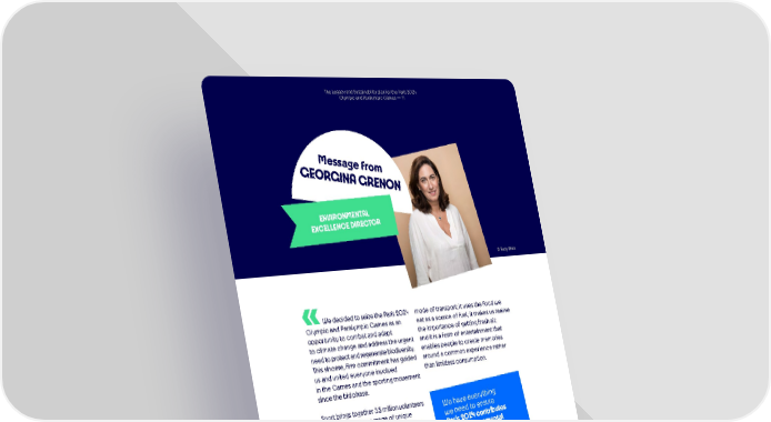 TThhe Le Leeggaaccy ay annd Sd Suusstataininaabbiliiltiy pty plalan fn foor tr thhe Pe Paarirs 2is 200224 4 OOlylymmppic aic annd Pd Paararalylymmppic Gic Gaammees s — 1— 111 Mes sag e fr GE om OR GINA GRENON AL ONMENT ENVIR OR T C CELLENCE DIRE EX © Rudy Waks We decided to seize the Paris 2024 mode of transport; it uses the food we Olympic and Paralympic Games as an eat as a source of fuel; it makes us realise opportunity to combat and adapt the importance of getting fresh air; to climate change and address the urgent and it is a form of entertainment that need to protect and regenerate biodiversity. enables people to create memories This sincere, firm commitment has guided around a common experience rather us and united everyone involved than limitless consumption. in the Games and the sporting movement since the bid phase. Sport brings together 3.5 million volunteers ything er e ev e hav W in France, evokes a range of unique e o ensur e need t w emotions with 2.5 million events taking es 4 contribut 02 aris 2 P place every year and showcases its al onment o the envir positive impact on society day in, day out t ormation ansf across the 180,000 sports clubs tr d of sport orl nationwide that promote education, of the w integration, gender equality and cohesion. However, the world of sport – like all other spheres of human activity and parts by ensuring we set our own benchmark, of society – needs to undergo accelerating the roll-out of innovative an environmental transformation. solutions for spectacular and sustainable Moreover, we firmly believe that sport events, as well as working with can be harnessed to build a more everybody in the Paris 2024 family sustainable society in which people so that our methods and achievements demonstrate greater solidarity and are leave a tangible and intangible legacy. more mindful of nature and biodiversity. This plan is the result of the work Sport enables us to take in the beauty undertaken by everyone involved of our surroundings and understand in Paris 2024 since the bid phase why we need to protect the environment; and highlights the distance we still have it offers an excellent pollution-free to travel together.